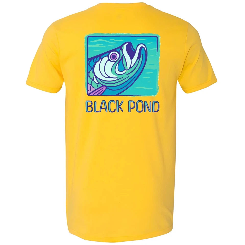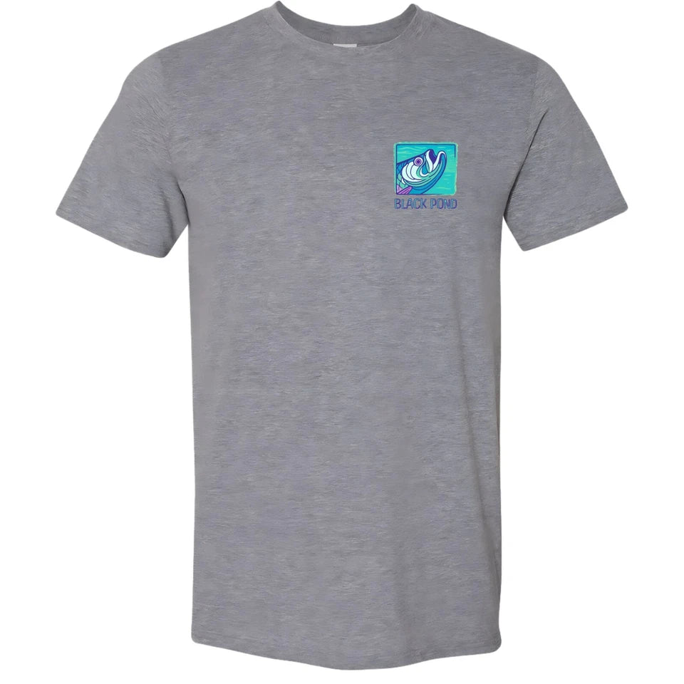 The Black Pond Saltwater Series Tarpon Fish Men's T-shirt is a solid crew neck shirt made from a comfortable cotton blend fabric. Featuring a tarpon fish design, this short sleeve shirt is perfect for inshore fishing enthusiasts. The shirt is handmade in the United States and is suitable for all seasons, making it a versatile addition to any angler's wardrobe. With a logo accent and the brand name Black Pond, this t-shirt captures the essence of the fishing theme perfectly.