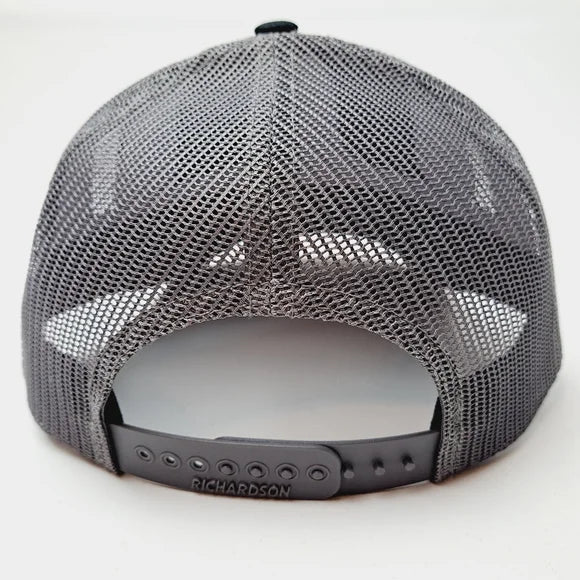 Brand new high-quality embroidered patch on a Richardson 112 Trucker Mesh Snapback Cap Hat Black & Gray