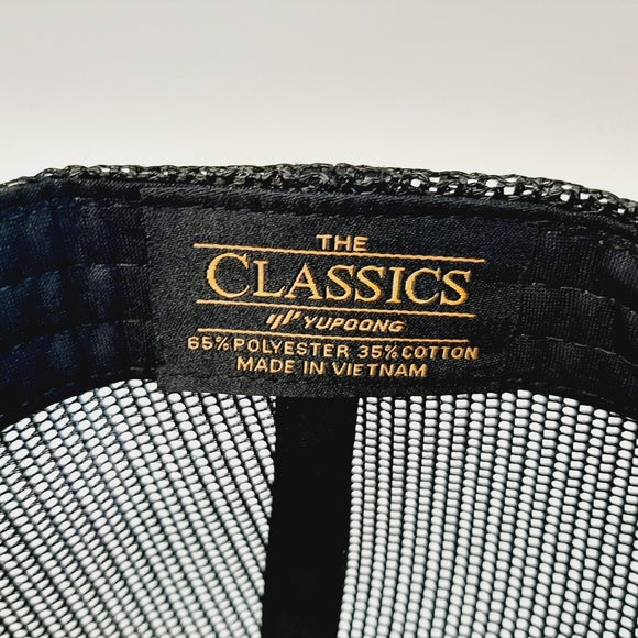 Brand new high-quality embroidered patch heat pressed onto a flatbill Snapback Mesh Trucker cap hat