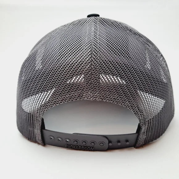 Brand new high-quality embroidered patch on a Richardson 112 Trucker Mesh Snapback Cap Hat Black & Gray