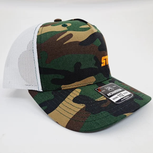Brand new high-quality embroidered patch on a Richardson 112 Curved Bill Trucker Mesh Snapback Hat Cap Camouflage